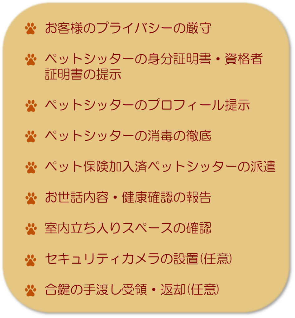 留守中のご自宅でのペットのお世話を安心しておまかせいただけるよう、以下の取り組みを行っております。