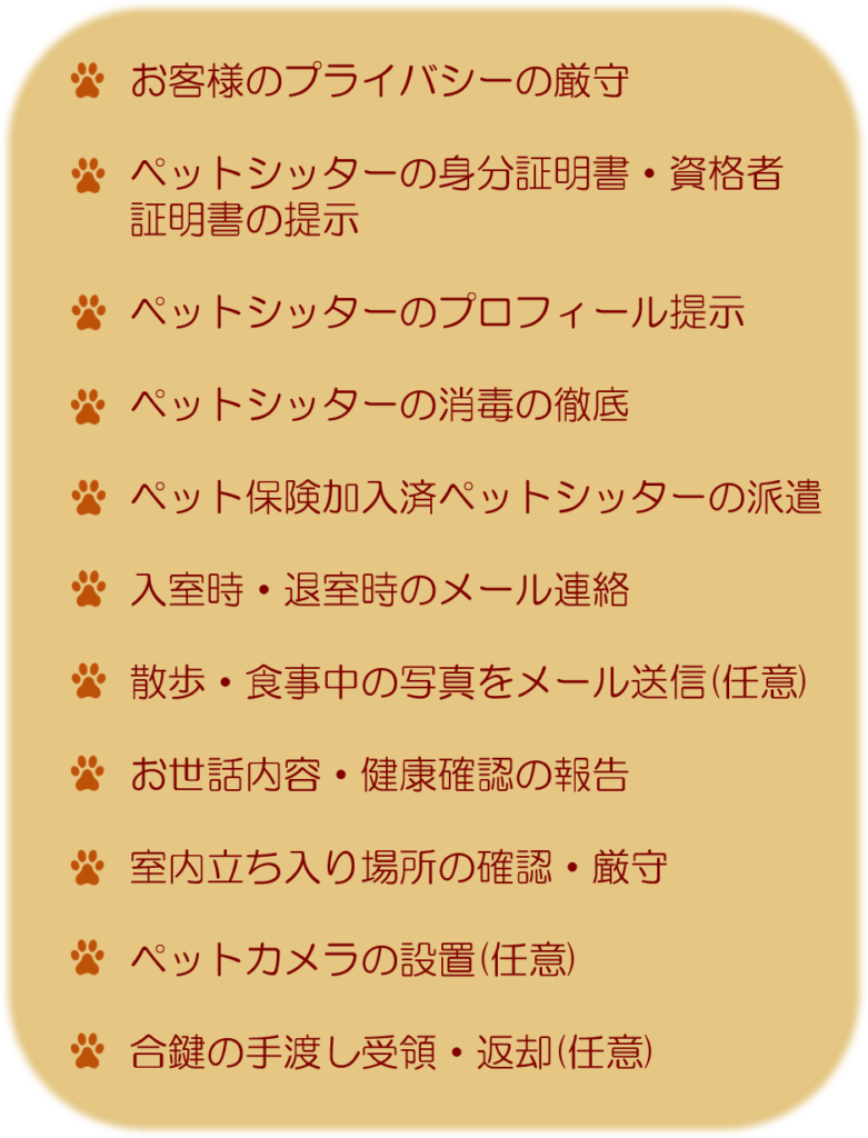 留守中のご自宅でのペットのお世話を安心しておまかせいただけるよう、以下の取り組みを行っております。