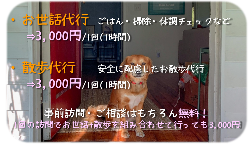 訪問時のお世話の内容は自由で、1回の訪問中に室内でのお世話と散歩を組み合わせてご利用いただくことも可能です。